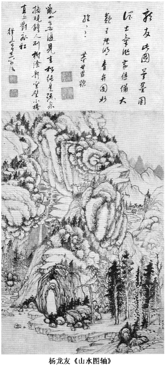 作为同门师弟的龚贤,以贬抑天都画派(即后来的新安画派)中坚人物程嘉燧﹑李永昌诸人而褒扬龙友,虽为情理之故,而失之妥当,然谓“龙友画固出于董宗伯,而能脱尽云间气习”,实为确论,这从龙友的笔意与画风,即可见其并不拘于董氏之风格法度,而上追元代黄公望﹑倪瓒意趣,师而不泥,风规自远。明末清初文人周亮工(1612-1672)撰《读画录》,其“杨龙友”条云: