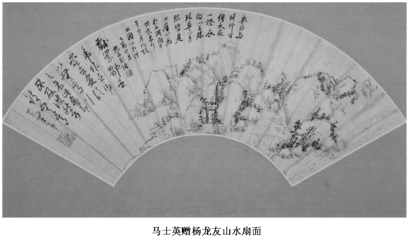 以上所举关于题马士英画的诗词,大都由人品而论艺品,或感慨世事,或叹惋节操,或讥讽风雅,然如张庚所云,士英“大节既隳,万事瓦解”,其书画流传至今,所存寥寥。在全国最具权威性和综合性的书画著录书——《中国古代书画图目》中,所见马士英作品也仅有四幅,其中有一幅马士英绘赠杨龙友的山水扇面,今藏于南京市博物馆。马士英题款:“戏学邹臣虎作。臣虎尝云:‘画须以无意行之。’余此画即不及彼,然可谓无意。马士英。”〔37〕弘光元年(1645)四月,龙友将此画转赠给万寿祺,并加题识云:“衣白与瑶草,皆传大痴(黄公望,1269-1354)一灯。衣白以古胜,瑶草以秀胜,皆是上座。此扇于文渊阁中赠余东行,年少见而悦之,因以相赠。乙酉四月,杨文骢识。”从马﹑杨二人的题识中,可见士英对绘画艺术的感悟与创见。