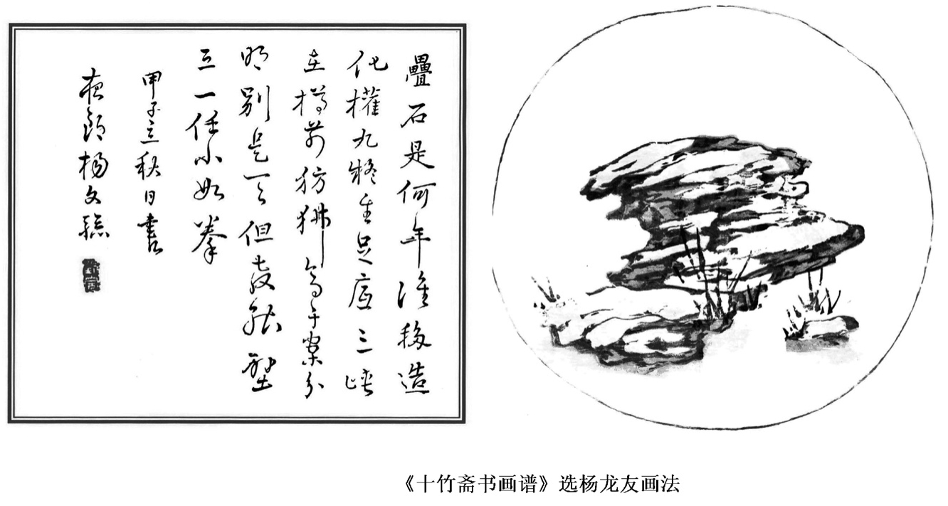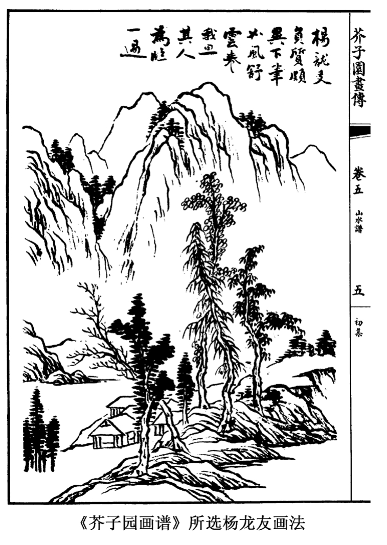 晚明是一个商业发达的社会,其中作为画学指南与艺术传播的“画谱”的出版,便是一个非常典型的文化现象。在明末和清初两种最为著名的画谱——《十竹斋书画谱》和《芥子园画传》中,都选录有杨龙友的作品示例。从文化传播的角度看,出版商对于名家画作的遴选是一个十分挑剔的文化行为,他们不仅要考虑被选者本身的人品素质和社会接受,还要看重其作品的示范效果和经典意义——当然,这些行为无疑都需基于出版商的商业利润而作。
